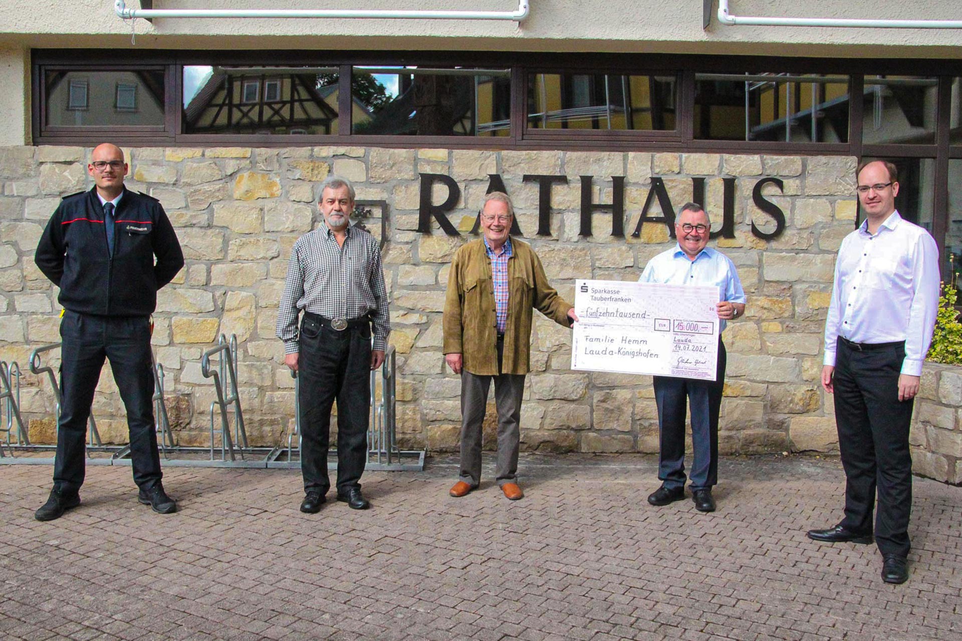 Die Bürgerstiftung und die Stadt Lauda-Königshofen konnten jüngst einen Spendenscheck an die von dem Gebäudegroßbrand am Pfingstsonntag in Lauda betroffene Familie übergeben.