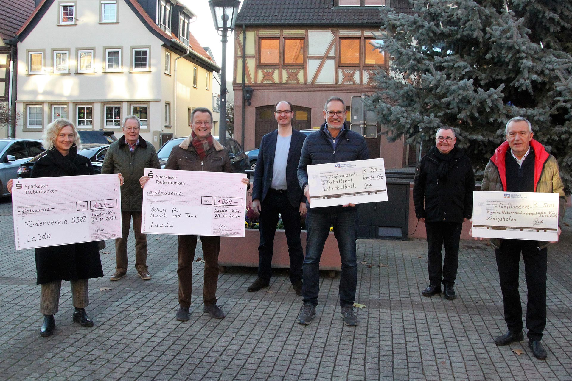 Foto: Der Vorsitzende der Bürgerstiftung Lauda-Königshofen, Gerhard Glöckner (2. von rechts) übergab im Beisein des Mitvorstandes Christian-Andreas Strube (2. von links) sowie Bürgermeister und Stiftungsratsmitglied Dr. Lukas Braun (Mitte) symbolische Schecks an Vertreter der diesjährigen Zuwendungsempfänger, deren Projekte aus generierten Spenden gefördert werden.