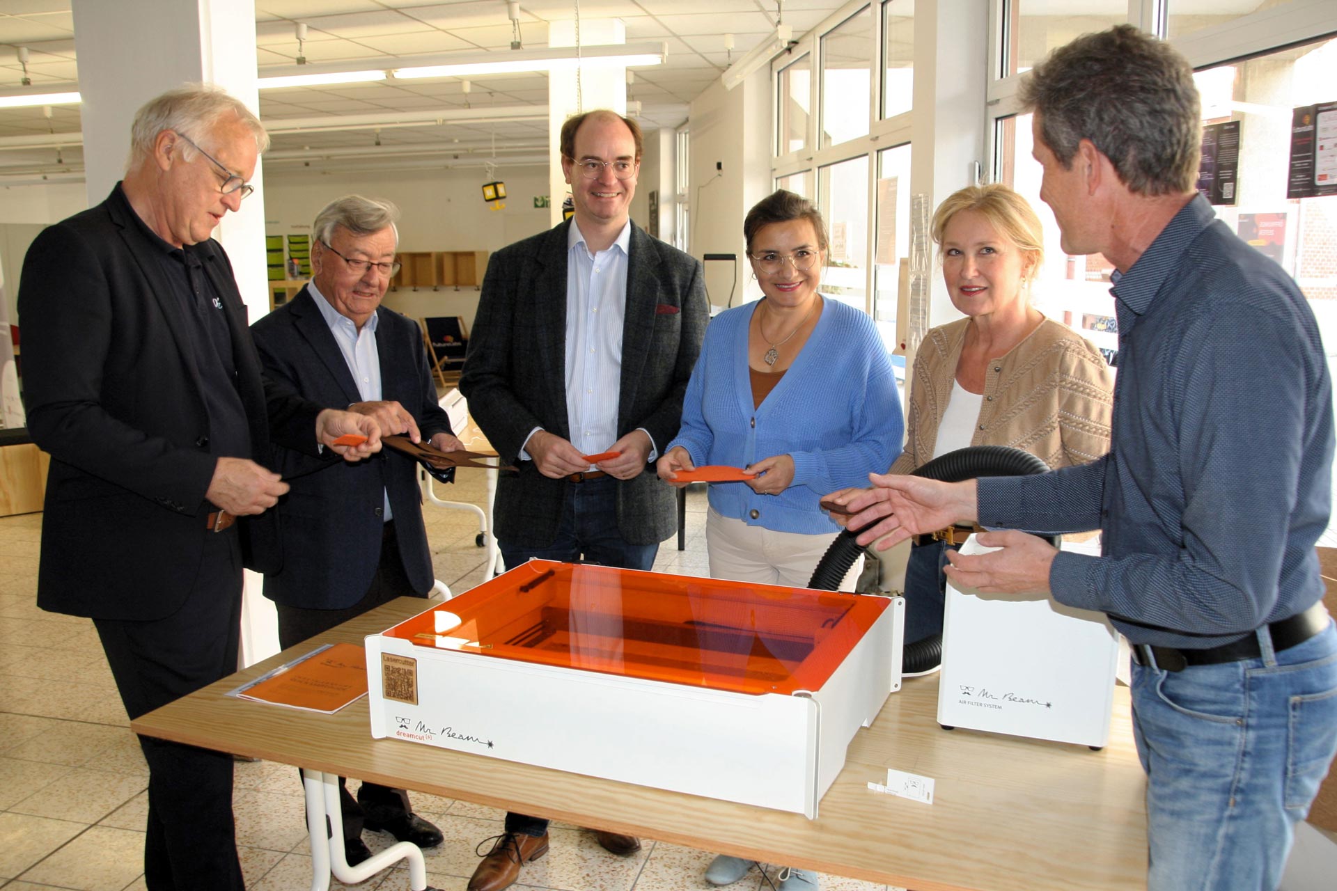 Foto: Besichtigten interessiert die neu eröffnete Futurelabs-Werkstatt und speziell den von der Bürgerstiftung Lauda-Königshofen bezuschussten Lasercutter: (Von rechts) Jürgen Besserer (Vorstandsvorsitzender), Dr. Cornelia Müller-Reiter (Stiftungsratsvorsitzende), Petra Jouaux (stellvertretende Vorstandsvorsitzende), Dr. Lukas Braun (Bürgermeister und Stiftungsratsmitglied), Dr. Gerhard Wobser (Initiator und langjähriger Vorsitzender der Bürgerstiftung) sowie Leo Köhler (stellvertretender Vorstandsvorsitzender).